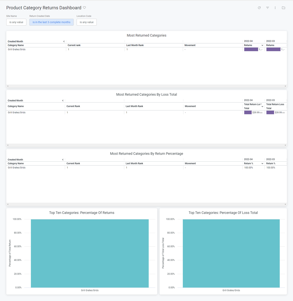 | Return Percentage | The count of returns divided by the count of order. |