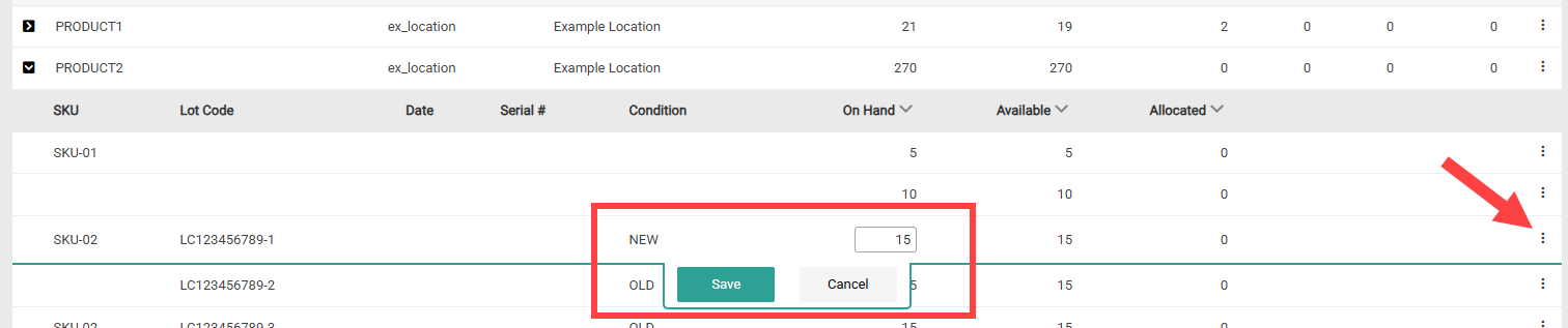 - To remove a condition, expand the actions menu on the far right of the row and click Delete. You should ensure that this condition has no allocated inventory before deleting it, meaning you may need to fulfill any allocated inventory and remove inventory records associated with it.