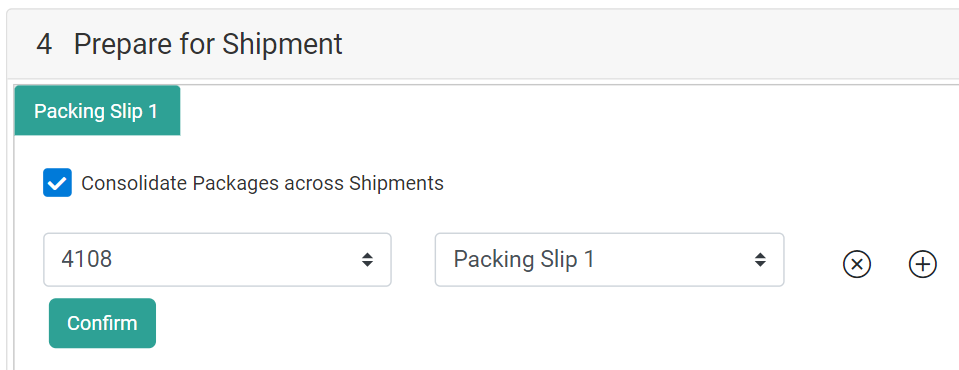 - During Prepare for Shipment (or Prepare for Delivery), toggle Consolidate Packages across Shipments and associate other shipments from the consolidation group with the appropriate packing slips using the drop-down menus that appear. In this example, Shipment 4110 and 4108 have been consolidated into one package.\